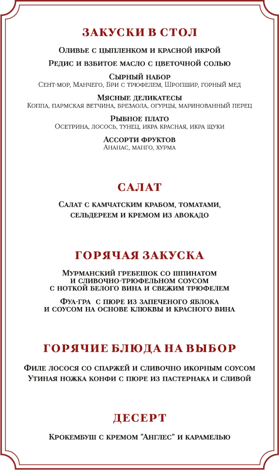 - Специальное праздничное меню от нашего шеф-повара: коллекция икры, утиная ножка конфи, мурманские гребешки в икорном соусе и многое другое